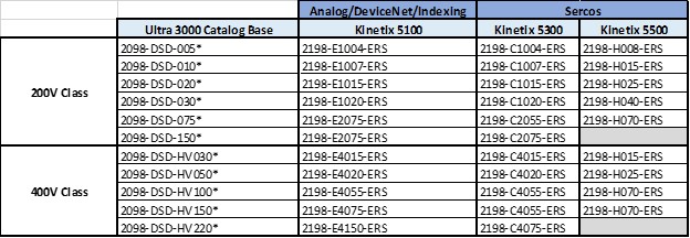 Reference the table below for a list of the Ultra 3000 drives that will be impacted and their recommended migration path to latest series of Kinetix servo drives.