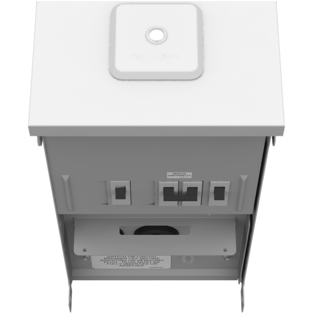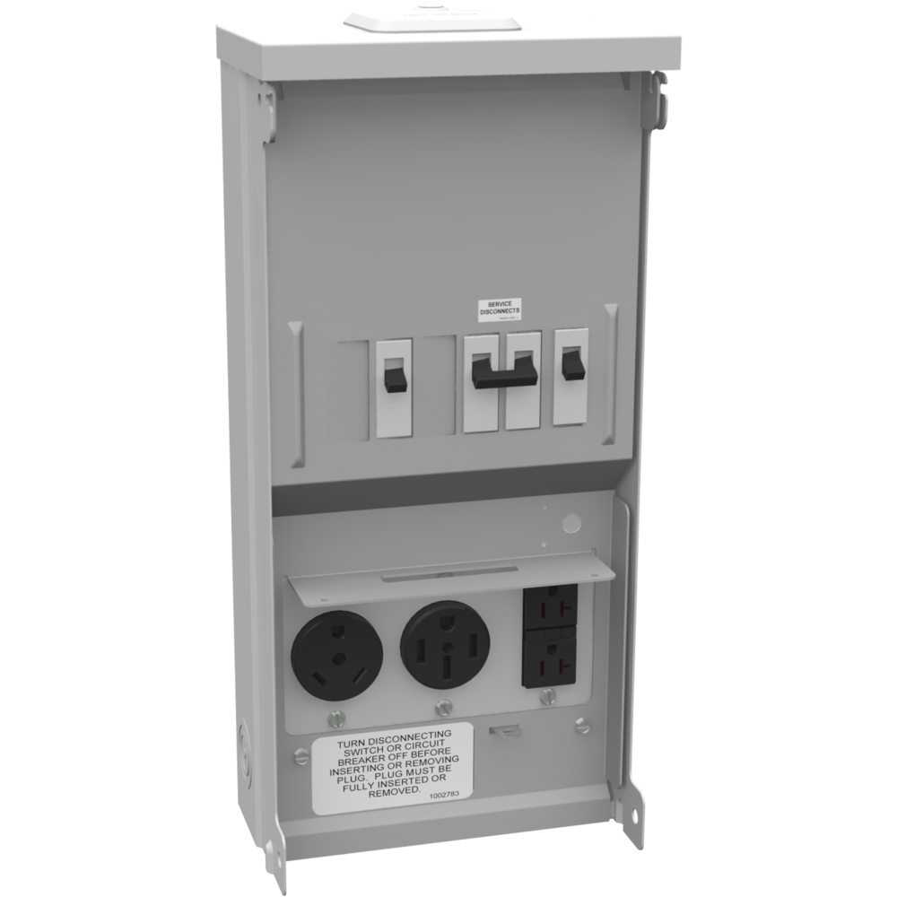 - Brand: MilbankAmperage Rating: 125 Continuous AmpereApplication: RV PowerBypass Type: No BypassCable Entry: Overhead or UndergroundCable Size: 14 AWG to 1/0 AWGControl: Single Pole 20 Ampere Breaker, Single Pole 30 Ampere Breaker, Double Pole 50 Ampere Breaker, No Main BreakerCountry of Origin: USACutout Size: One Single Pole 20 Ampere Breaker and One Single Pole 30 Ampere Breaker and One Double Pole 50 Ampere BreakerEnclosure: G90 Galvanized Steel with Powder Coat FinishEquipment Ground: Ground BarFrequency Rating: 60 HertzHub Opening: Small Closing PlateInsulation: Glass PolyesterJaw Quantity: 0 TerminalsLine Side Wire Range: 14 - 2/0 AWGMaterial: G90 Galvanized SteelMounting: Surface MountNumber of Cutouts: 3Number of Meter Positions: Single Power HeadNumber Of Receptacles: 3Phase: 1 PhaseReceptacle Configuration: NEMA 14-50, NEMA TT30, NEMA 5-20 Ground Fault ReceptacleSize: 5.188L x 8.875W x 19.25HSpecial Features: Single Pole 20 Ampere Breaker and Single Pole 30 Ampere Breaker and Double Pole 50 Ampere BreakerStandard: UL Listed;Type 3RTerminal: Lay inType: Unmetered Power SupplyVoltage Rating: Up to 240 Volts Alternating Current