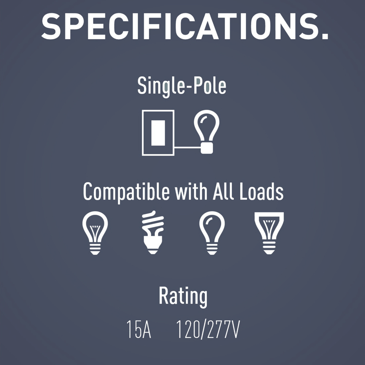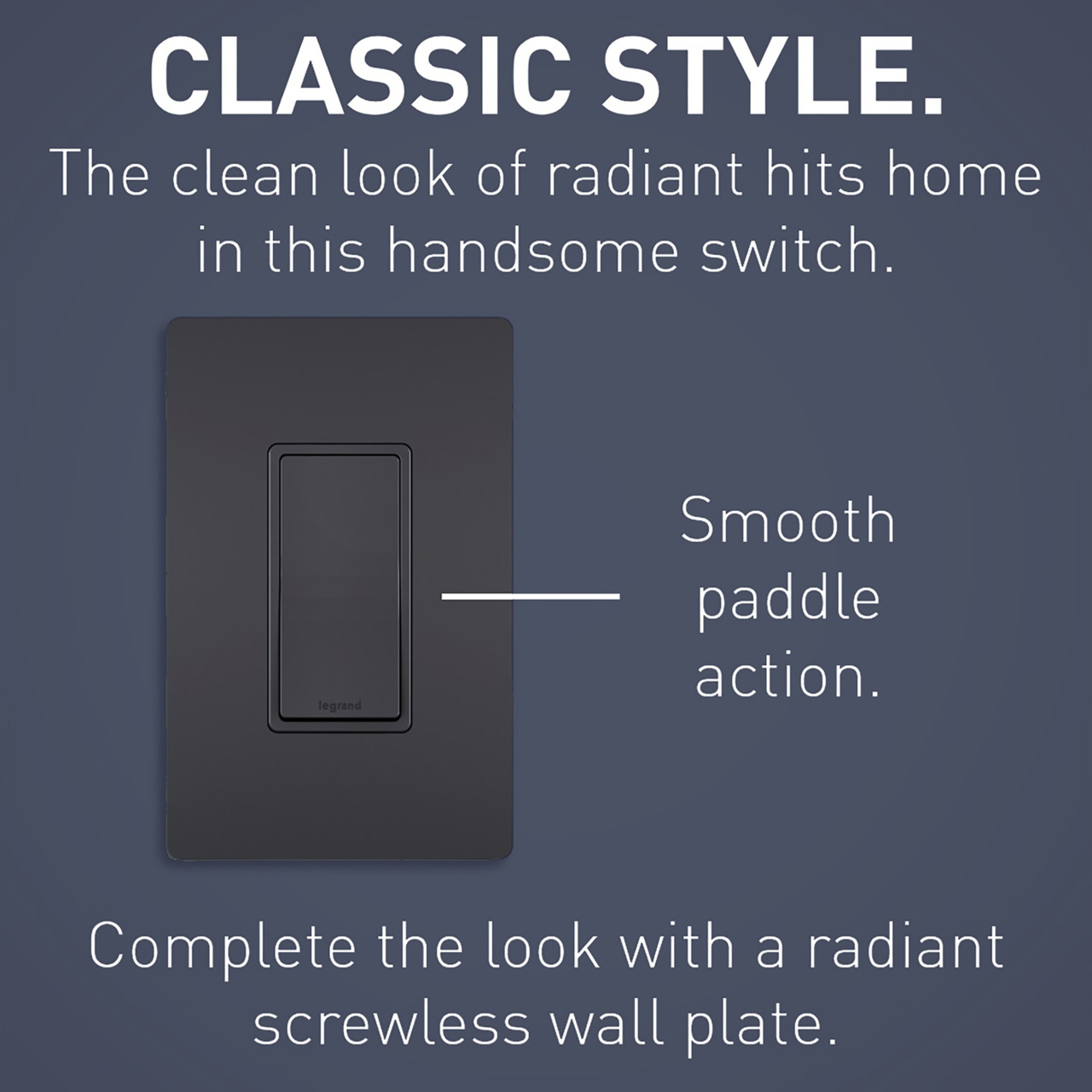 Pass & Seymour® radiant® Decorator Switch, 120/277 VAC, 15 A, 1 Pole, Wall, Screw Terminal, Thermoplastic, Graphite, 4.19 in H x 1.43 in W x 1.27 in D