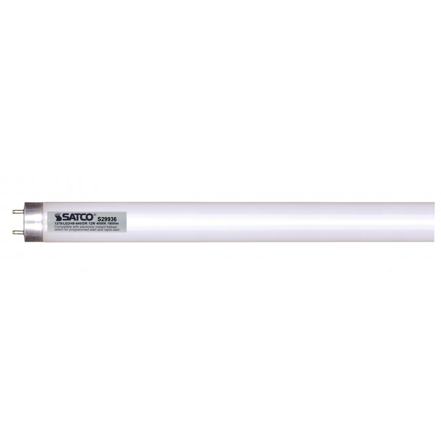 - SATCO LED Lamp, 12T8/LED/48-840/DR Designation, 12 W Wattage, 120 VAC, LED Lamp, 2-Pin G13 Medium Lamp Base, T8 Shape, 1800 Lumens Lumens, 50000 hr Average Life, Cool White, 82 CRI, 4000 k Color Temperature, Gloss White Lamp, Instant/Rapid Start, Non-Dimmable Ballast, 210 deg Beam, 1 in MOD x 48 in MOL Dimensions