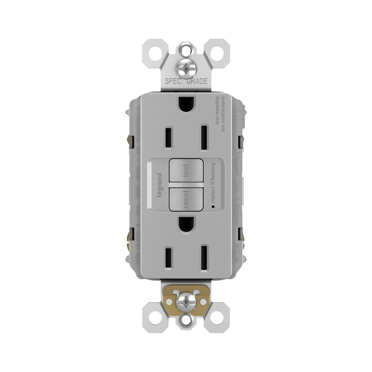 - Pass & Seymour Radiant GFCI Receptacle, Duplex Self-Test Tamper-Resistant, Series: 1597TR, 125 VAC, 15 A, 60 Hz Frequency, 2 Pole, 3 Wires, NEMA 5-15R NEMA Rating, Commercial/Residential/Specification Grade, -35 to 66 deg C, Back/Side Wire Terminal, Thermoplastic, Gray, 1.03 in L x 1.73 in W x 4.2 in H Dimensions