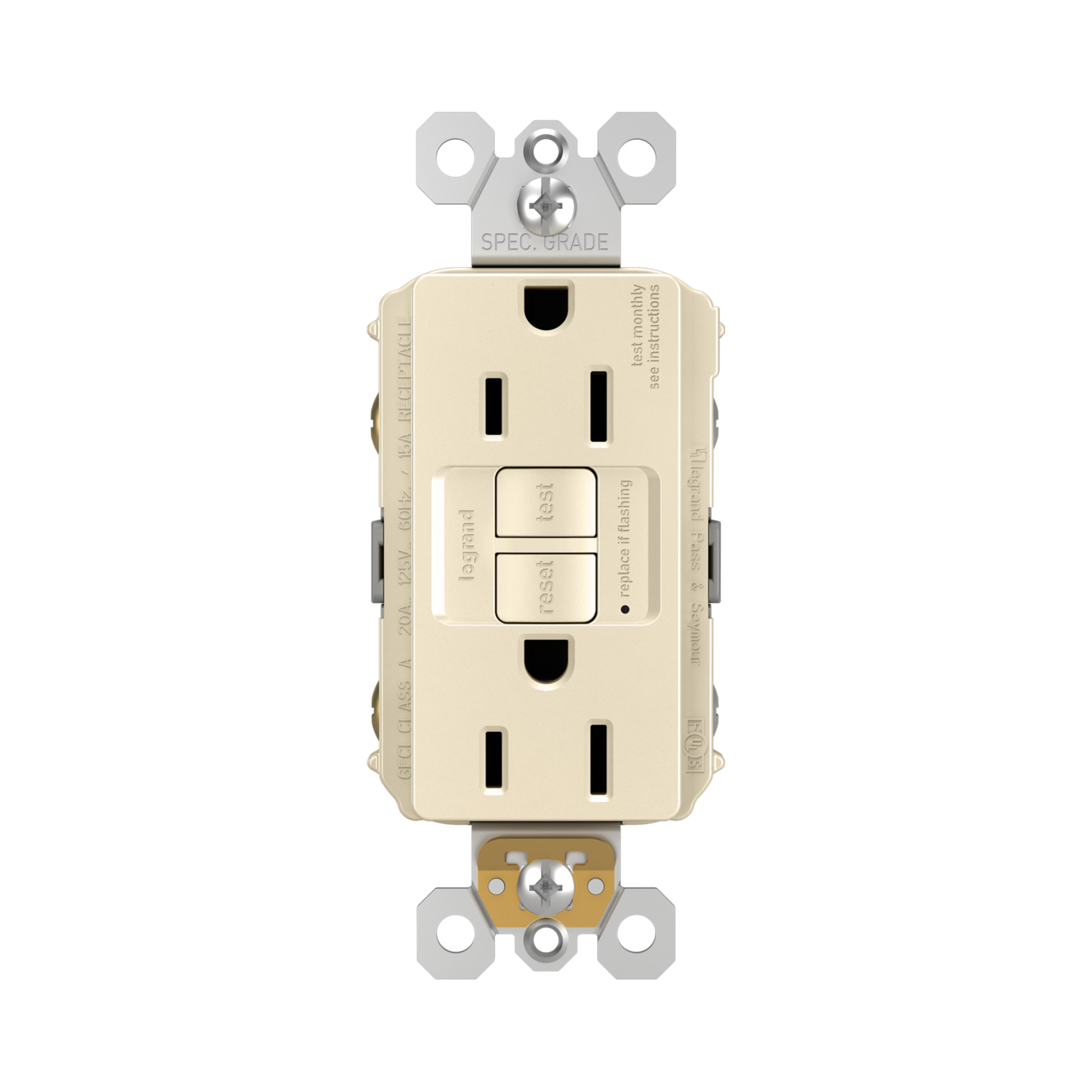- Pass & Seymour Radiant GFCI Receptacle, Duplex Self-Test, Series: 1597, 125 VAC, 15 A, 60 Hz Frequency, 2 Pole, 3 Wires, NEMA 5-15R NEMA Rating, Residential/Specification Grade, -35 to 66 deg C, Back/Side Wire/Screw Terminal, Nylon/Thermoplastic, Light Almond, 1.03 in L x 1.73 in W x 4.2 in H Dimensions