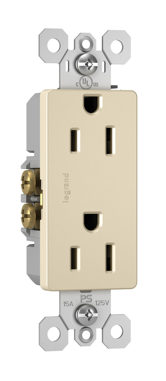 - Pass & Seymour Straight Blade Receptacle, 2-Gang Decorator Duplex, 125 VAC, 15 A, 2 Pole, 3 Wires, NEMA 5-15R NEMA Rating, Commercial/Residential Grade, -40 to 60 deg C, Push-In/Side Wire Terminal, Thermoplastic, Light Almond, 4.2 in H x 3.31 in W x 1 in D Dimensions