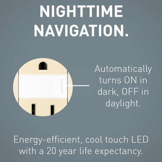 - Pass & Seymour Radiant Night Light, Series: NTL, 15 A, 125 VAC Electrical Rating, 2 Pole, 3 Wires, 14 to 12 AWG Wire, LED Lamp, NEMA 5-15R Enclosure, -40 to 115 deg C, Surface/Threaded Mounting, Thermoplastic, Light Almond, 1.6 in W x 1.5 in D x 2.75 in H Dimensions