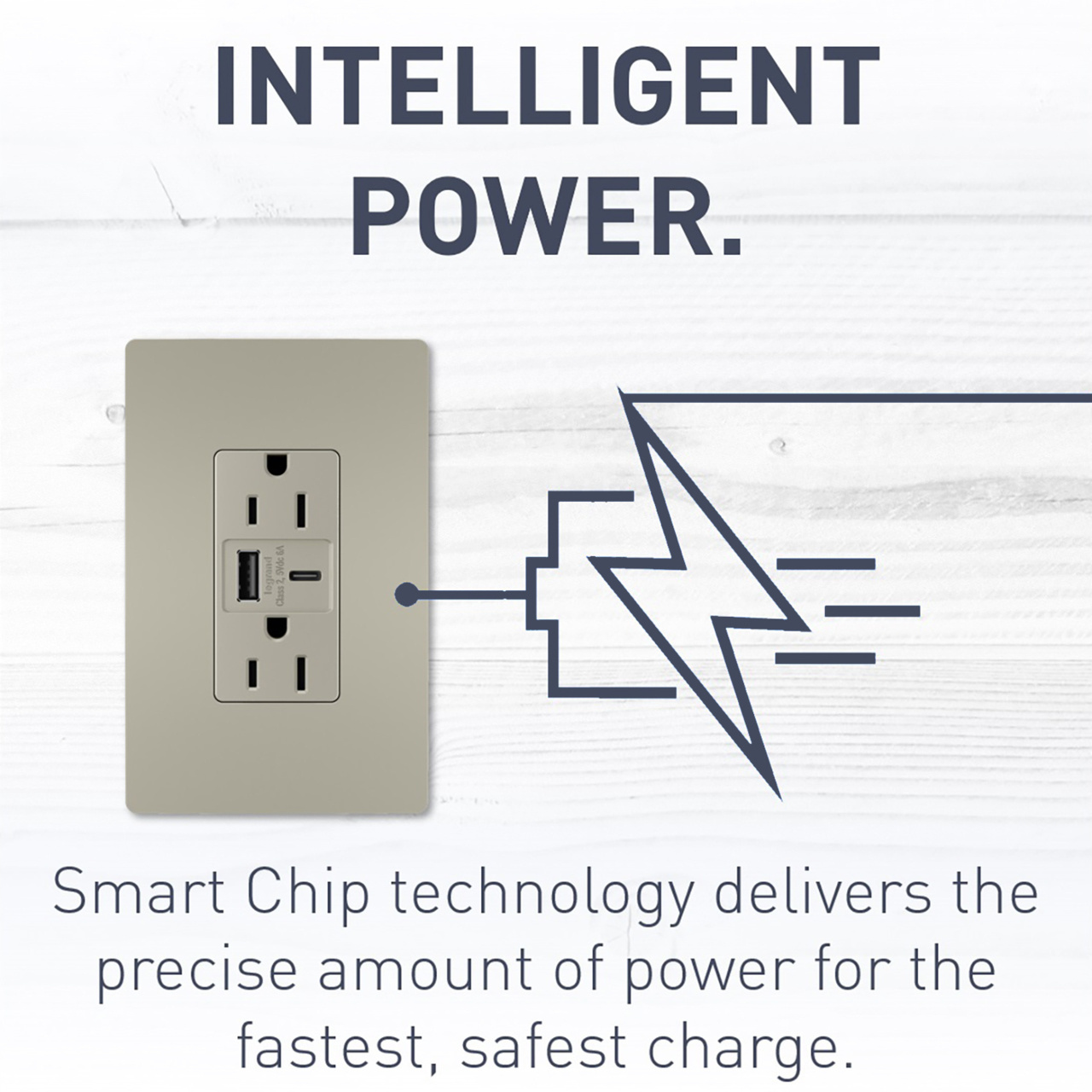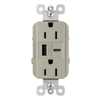 - Pass & Seymour USB Charging Receptacle, Duplex Hybrid Ultra-Fast, Series: radiant, 15 A, 125 VAC Electrical Rating, 14 to 10 AWG Wire, Type-A USB 2.0/C USB, 2 USB Quantity, 6 A USB, 2.69 in H x 1.74 in W x 1.67 in D Size, Screw Connection, Wiring Method: Back/Side Wire, Nylon/Polycarbonate, Nickel, Environmental Conditions: -40 to 60 deg C Operating Temperature