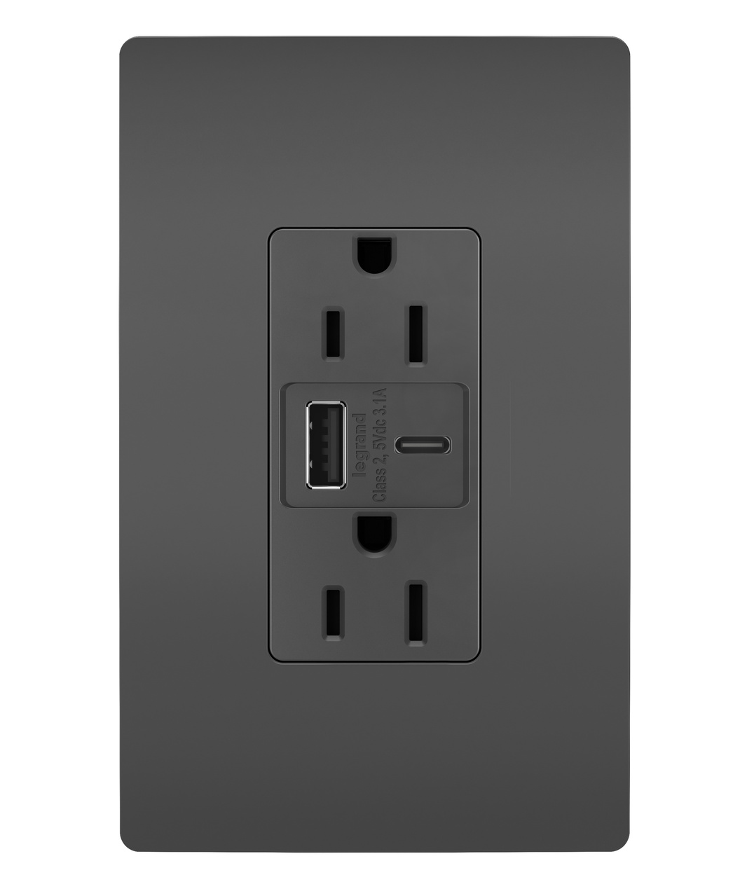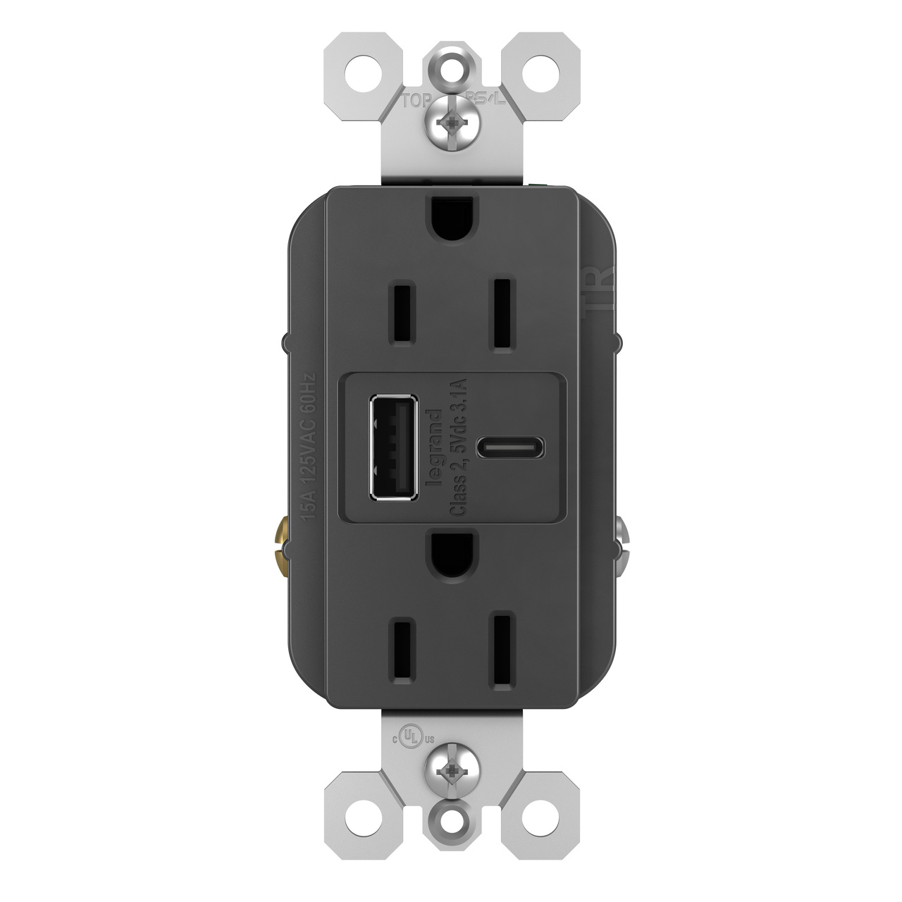 - Pass & Seymour radiant USB Charger, Hybrid, 125 VAC, 15 A Electrical Rating, 14 to 10 AWG Wire, Type-A USB 2.0/C USB, 3.1 A USB, 4.18 in H x 1.69 in W x 1.35 in D Size, Screw Connection, Wiring Method: Back/Side Wired, Polycarbonate, Black, Environmental Conditions: -40 to 60 deg C Operating Temperature