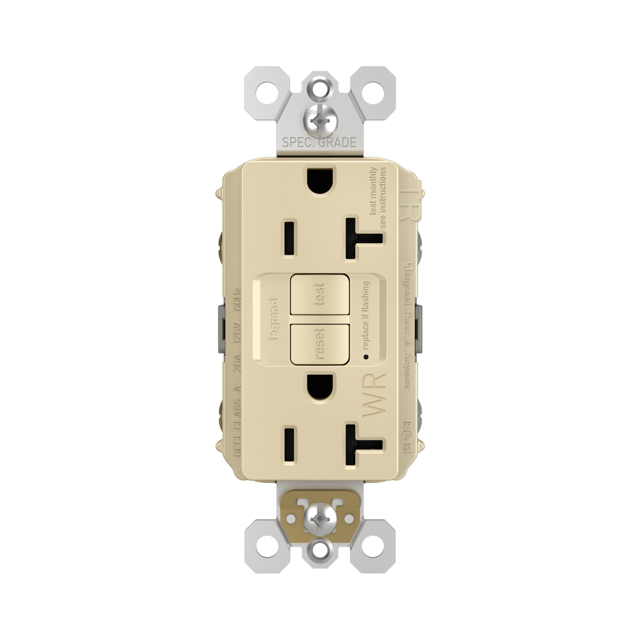 - Pass & Seymour Radiant GFCI Receptacle, Duplex Self-Test Tamper/Weather-Resistant, Series: 2097TRW, 125 VAC, 20 A, 60 Hz Frequency, 2 Pole, 3 Wires, NEMA 5-20R NEMA Rating, Specification Grade, -35 to 66 deg C, Back/Side Wire/Screw Terminal, Nylon/Thermoplastic, Ivory, 1.03 in L x 1.73 in W x 4.2 in H Dimensions
