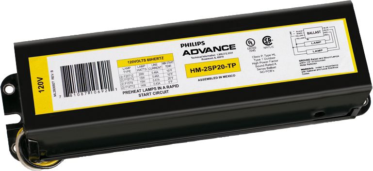 - Advance, RL2SP20TPI, Electromagnetic Fluorescent Ballast, Series: Standard, T12 Lamp, 20 W Lamp, 120 VAC, 0.49 A, 60 Hz Frequency, Pre-Heat Start, 30 deg F Minimum Starting, Total Harmonic Distortion: 10 %, Power Factor: 0.61, 2 Lamps, Ballast Factor: 0.61, ANSI C82.1 Ballast Grade, Metal, 6.5 in L x 2.38 in W x 1.5 in H Dimensions