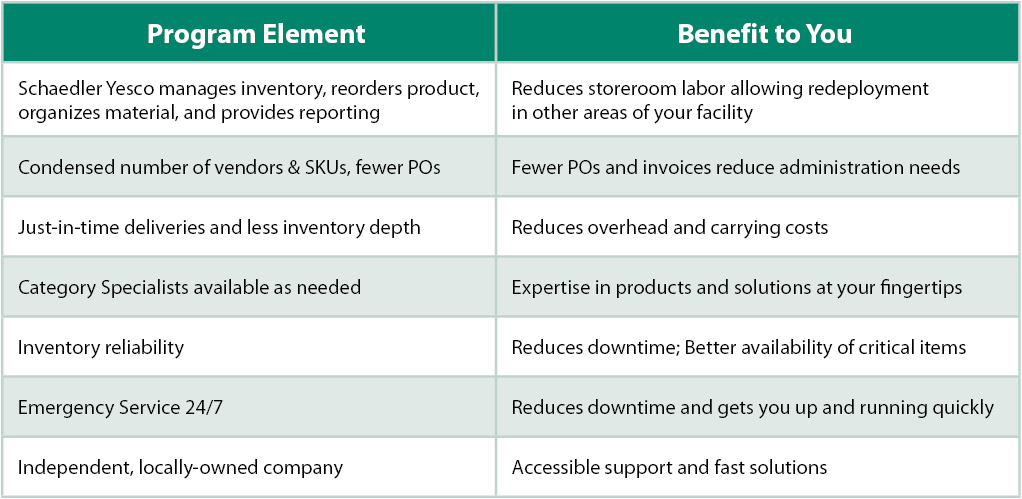 The Schaedler Yesco inventory management systems are fully customized inventory solutions for materials and components right on your jobsite or in your facility. As your partner, we will help you identify dead stock and duplicate supply to reduce inventory costs and administration. Our dedicated team will develop, organize, and launch your program based on YOUR needs. Unlike services from other suppliers, we understand that one size does not fit all.
