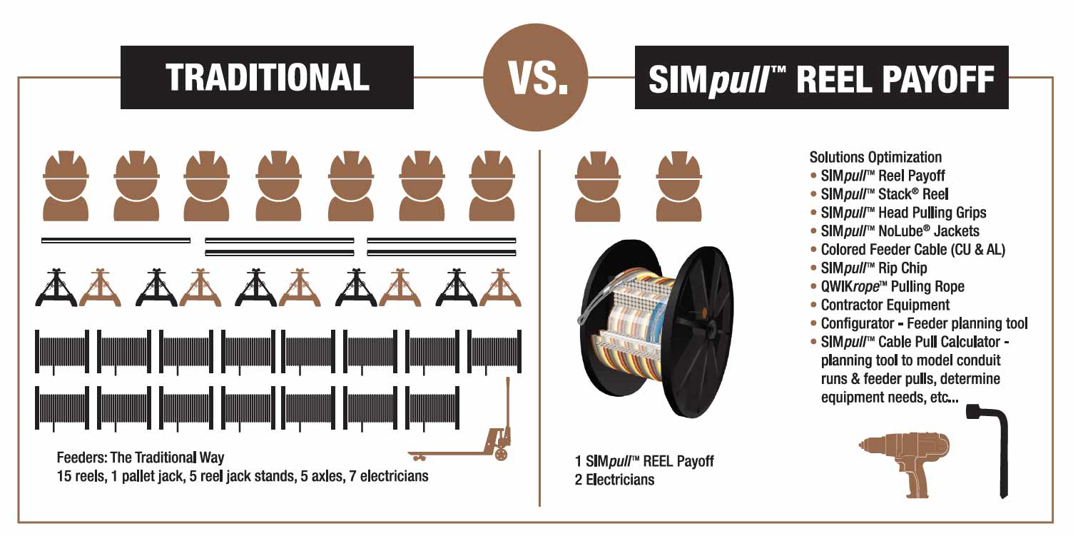 Moving, setting up, and paying off feeder cable reels inside buildings or structures can be extremely challenging, often requiring a tremendous amount of labor, equipment, tools, physical effort, and time. The SIMpull™ Reel Maneuverable Payoff System revolutionizes the job site by allowing one person to safely move a reel that weighs up to 6,000lbs., without the need for pallet jacks or other equipment. When combined with Southwire's NoLube® technology, innovative Qwikrope™ and time saving pulling equipment, the entire system offers amazing savings and safety.