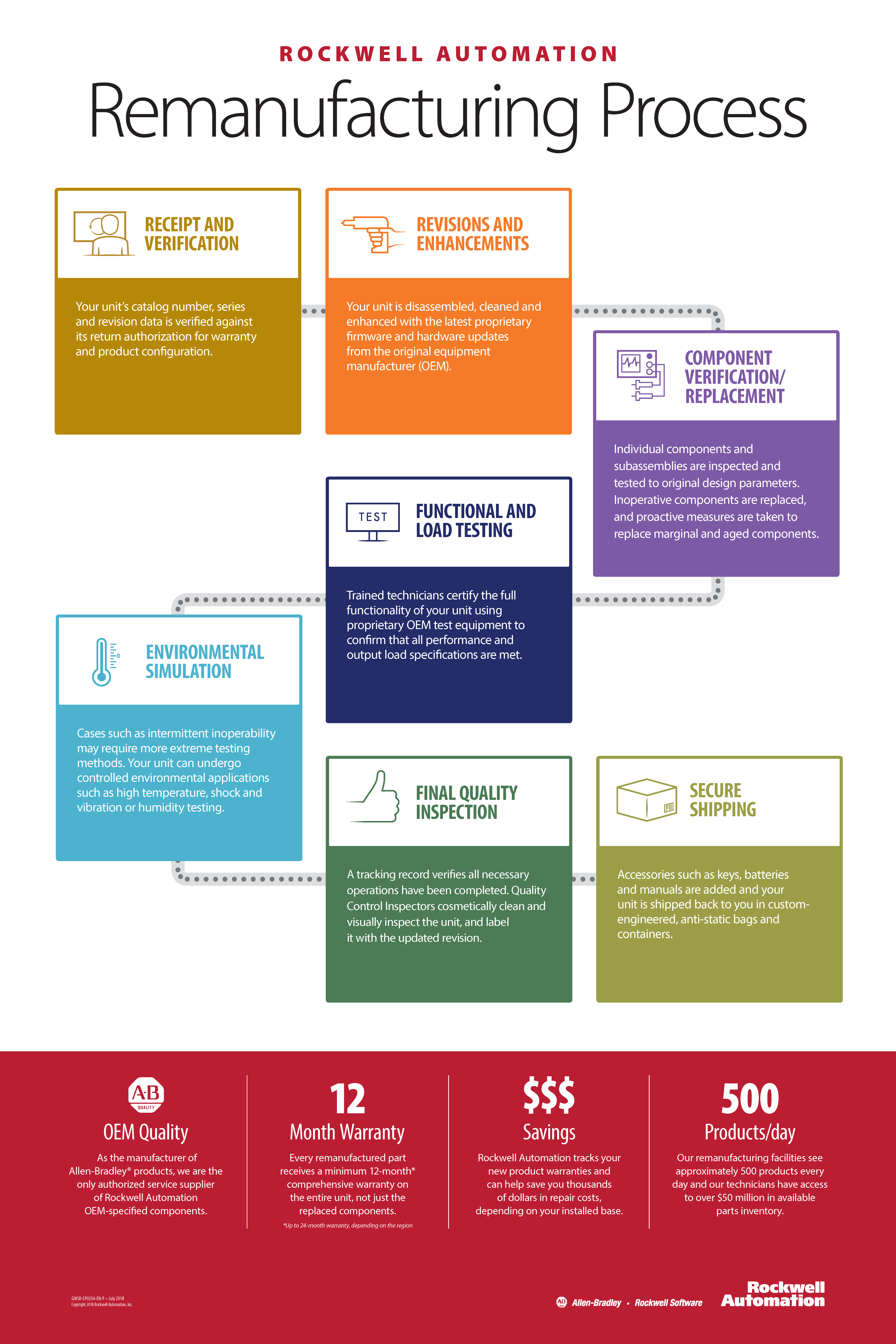 Rockwell's 10 global, ISO-certified equipment remanufacturing facilities use the same high-quality parts, standards, and specifications as the original manufacturing process. This means you can restore your automation equipment to like-new or better condition, to enhance performance and extend product life. Depending on the service level you select and your region, all remanufactured equipment includes a 12-, 18-, or 24-month warranty.